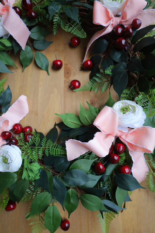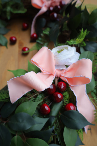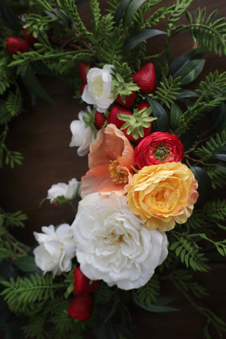 With creamy ranunculus, rich faux cherries, and a scalloped blush ribbon, Mon Chéri brings just the right mix of polish and personality. A go-to for front doors, sunrooms, and kitchen nooks that love a little romantic detail.