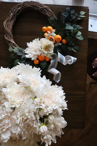 Ivory poppies, delicate dahlias, and lifelike clementines bring warmth and texture to Clementine Blossom. Finished with a crisp blue-and-white ribbon, this piece feels elevated but easy — like summer, styled.